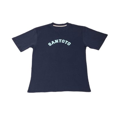Camiseta cuello redondo manga corta, material en tejido de punto flexible, ligero y cómodo, silueta oversize , con hombro caido y más larga en cadera. Tono azul oscuro con estampado en frente en tono celeste, estampado ” SANTOTO”. Esta camiseta es clave para generar múltiples estilos.